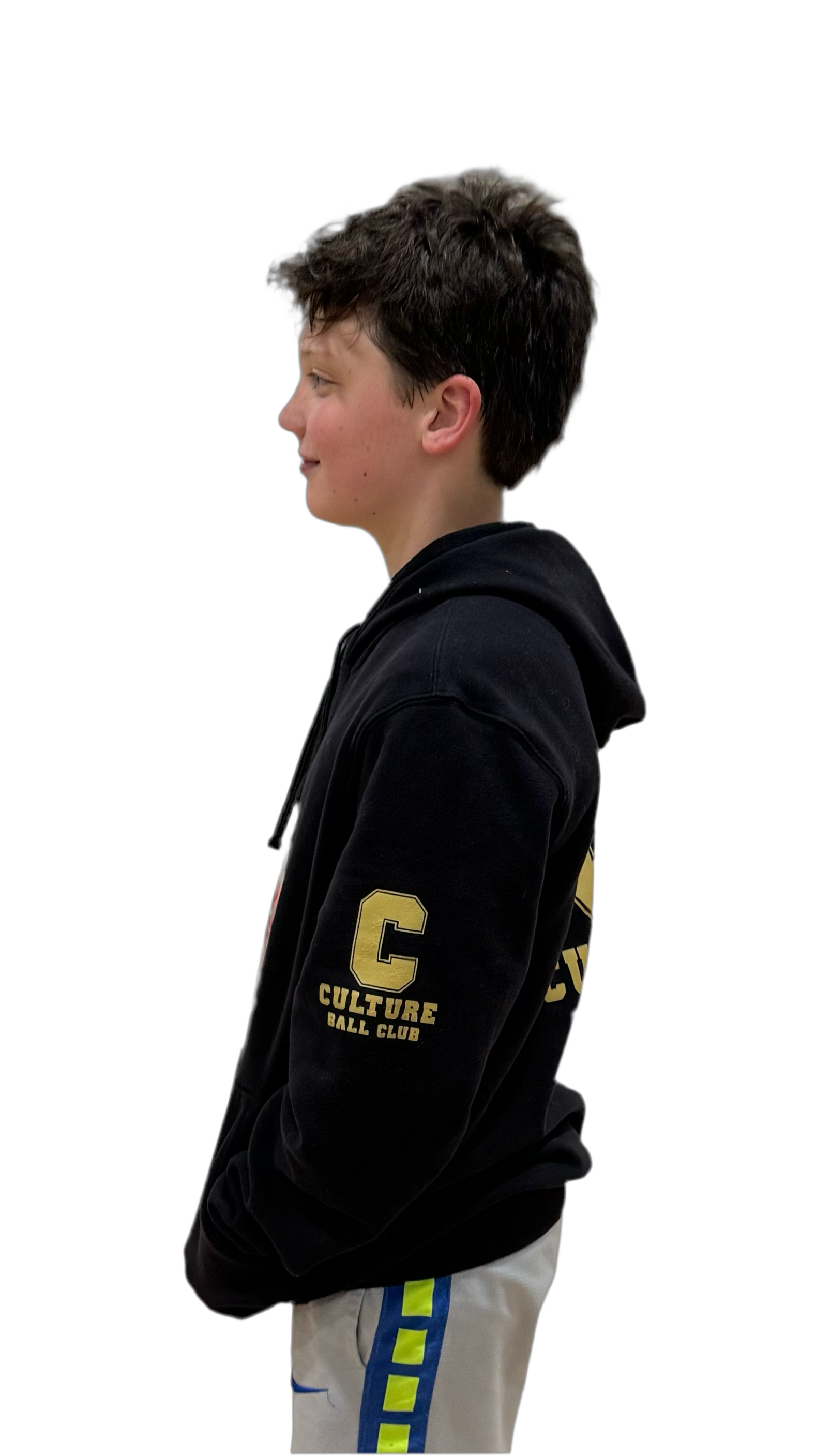 Black Gildan Hooded Sweatshirt, with Donut Lock logo on the front and Culture "C" and "CULTURE BALL CLUB" in gold on the left sleeve and back of the sweatshirt.